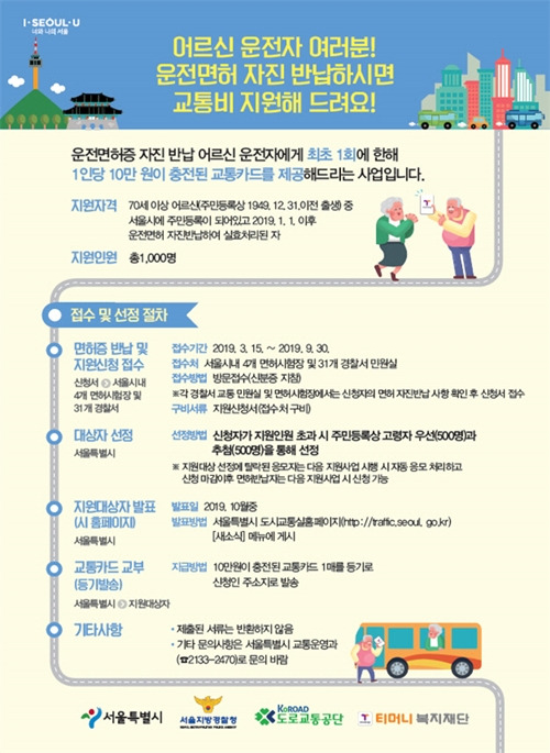 [1] 동행·매력 특별시 서울 - 운전면허 자진반납 어르신 교통카드 지원 사업 - 분야별정보 (https://news.seoul.go.kr/traffic/archives/509469)